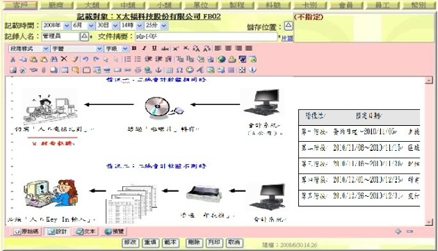 (下圖展示正在編修某一筆客戶文件錄,其中包含有文字、圖片、表格等資訊)