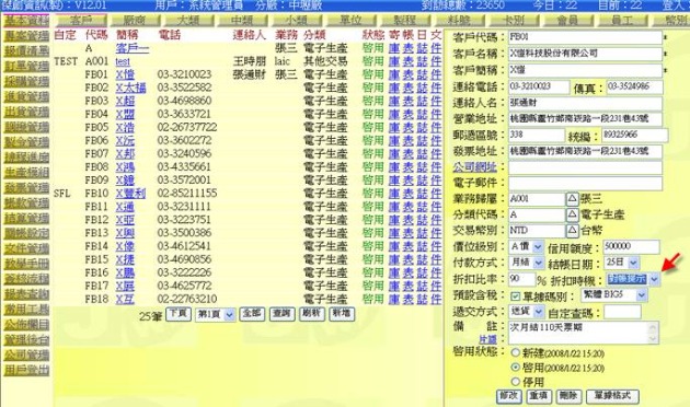 - 結帳日期欄位(如下圖紅色箭頭處)將影響出貨單在開立當時的「結帳月份」欄位的預設值,例如某客戶之結帳日期指定為25日,則在3/25日(含當日)之前,在開立出貨單時,出貨單的結帳月份將自動被判定歸屬為3月份,但若是在3/25日以後所開的出貨單,其結帳月份就會被自動判定為下月份(4月)。
