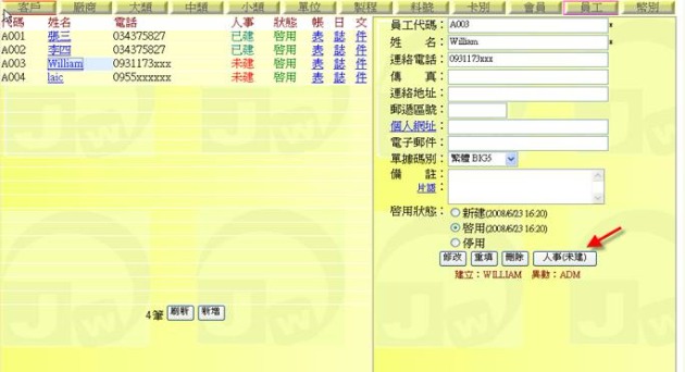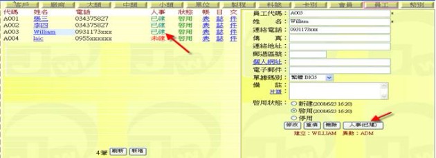 - 當送出並建立好人事資料卡時,左側員工資料表列中就會呈現人事「已建」狀態。