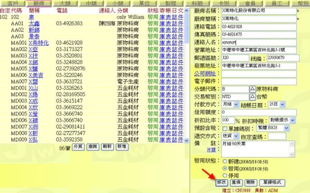 - 點擊左側表列中某一筆廠商記錄的「簡稱」欄位,即可在右側窗格呈現出該廠商的表單欄位,當修改完成後按下表單下方「修改」按鈕(如下圖紅色箭頭處),即可完成修改動作。