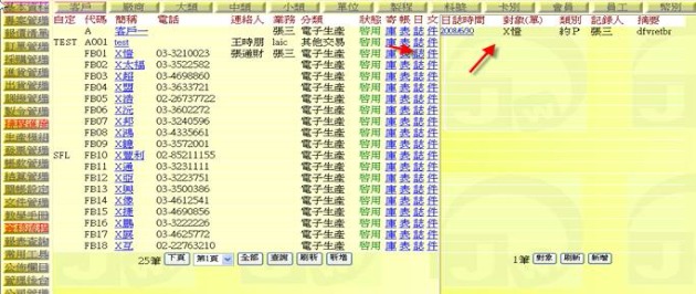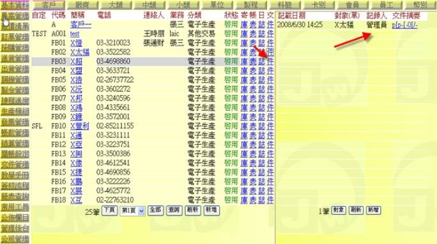 - 點擊客戶表列中某一筆客戶記錄中的文「件」欄位(如下圖紅色箭頭處),即可展開與該客戶有關的文件錄(右表)。