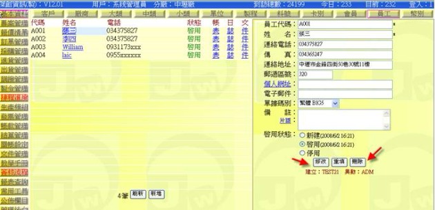 - 點擊左側表列中某一筆員工記錄的「姓名」欄位,即可在右側窗格呈現出該員工的表單欄位,當修改完成後按下表單下方「修改」按鈕(如下圖紅色箭頭處),即可完成修改動作。