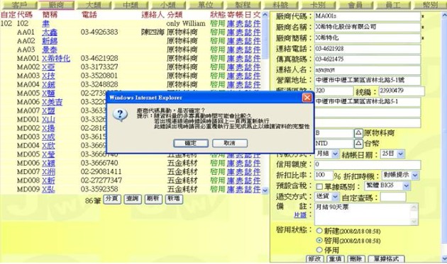 - 若有修改廠商代碼時,會出現提示訊息如下圖,按下確定後會同步異動所有單據中相應的廠商代碼。