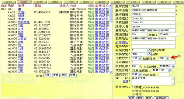 - 結帳日期欄位(如下圖紅色箭頭處)將影響進貨單在開立當時的「結帳月份」欄位的預設值,例如某廠商之結帳日期指定為25日,則在3/25日(含當日)之前,在開立 進貨單時,進貨單的結帳月份將自動被判定歸屬為3月份,但若是在3/25日以後所開的進貨單,其結帳月份就會被自動判定為下月份(4月)。