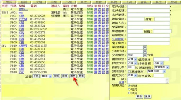 - 點擊左側表列中某一筆客戶記錄的「簡稱」欄位,即可在右側窗格呈現出該客戶的表單欄位,再按下表單下方「刪除」按鈕(如下圖紅色箭頭處),於回覆確定後即可完成刪除。