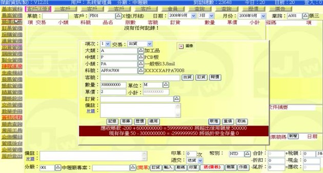 - 當有設定信用額度值時(不為0),則當應收帳款累計超出此值時,在打出貨單時就會被禁止或警示(視參數調整而定)。
