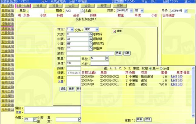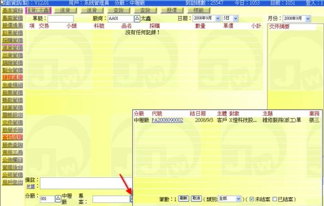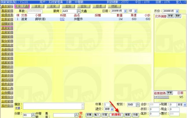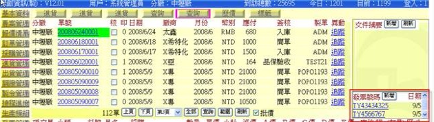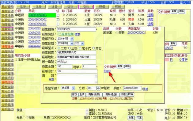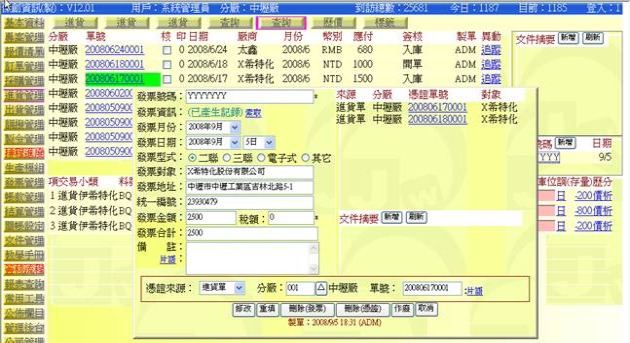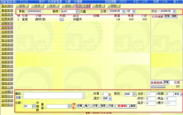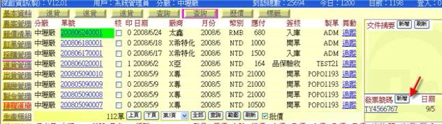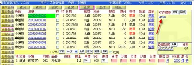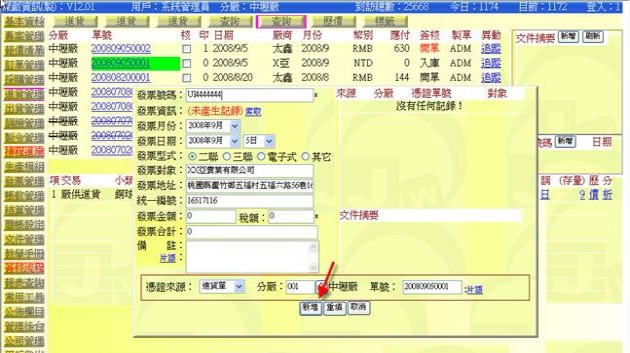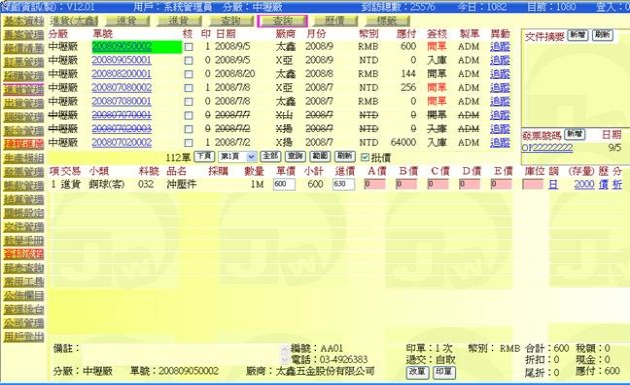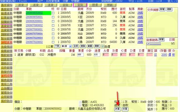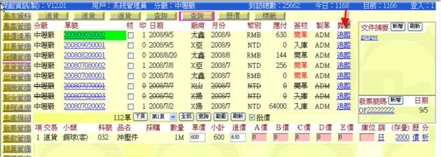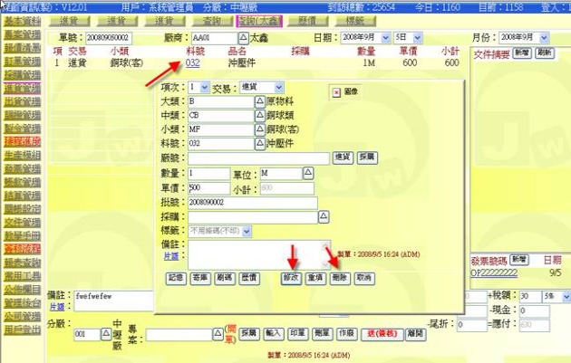 (下圖示範被叫出的單據,注意上方次功能的「查詢(太鑫)字樣」,它代表正在修改的單子屬於太鑫這個廠商)