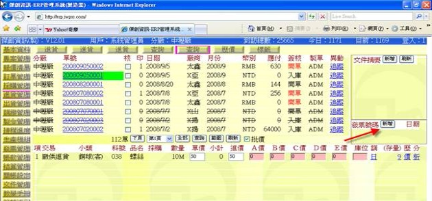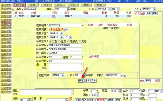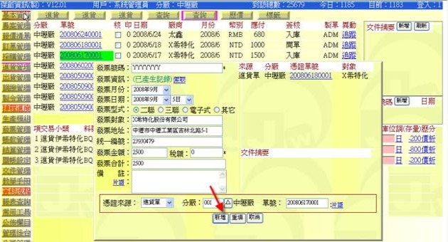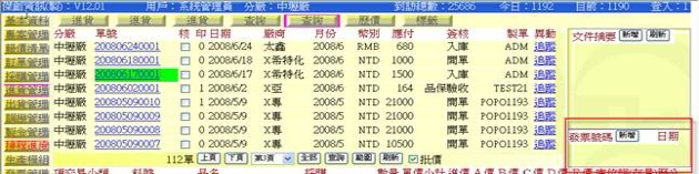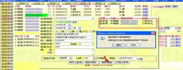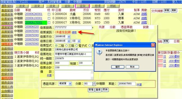 - 例如 200806180001 跟 200806170001 是要開出同一張發票號碼,且若在 200806180001 已先作出一筆發票記錄,當在 200806170001 新增填上發票號碼時(跟 200806180001 同一個發票號碼 YYYYYYY),這時可按下「索取」,系統會查找並在「發票資訊」欄位處顯示 "已產生記錄" 字樣,並詢問是否調入相同的發票欄位,若回應「確定」,就可以把 YYYYYYY 的發票資料寫入(提示:發票分攤金額部分要自行輸入計算)。
