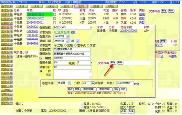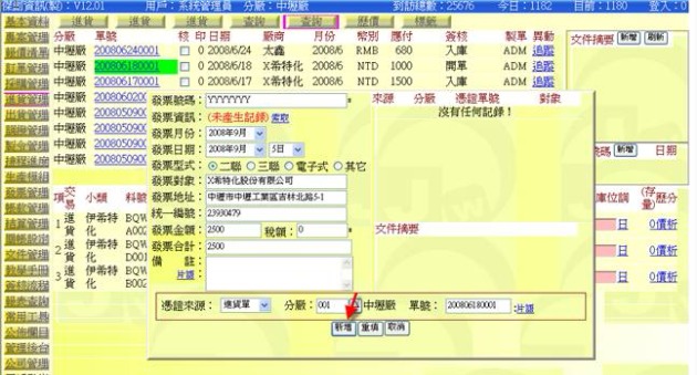 (圖二:先在 200806180001 單據上新增 YYYYYYY 發票資訊)