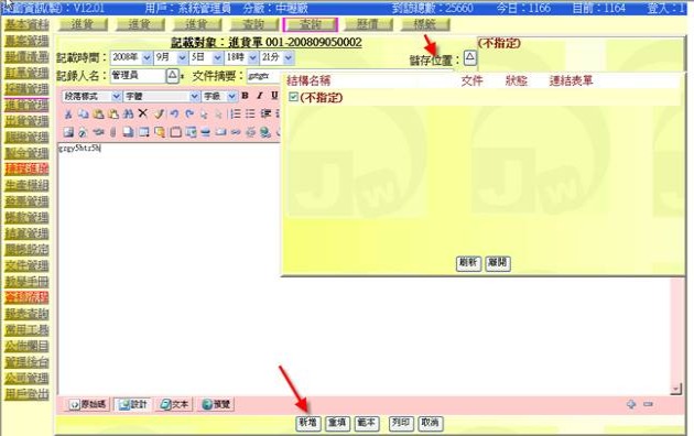 - 若有啟用「簽核模組」與「簽核流程」,則在完成進貨作業前必須按下方「送(簽核)」按鈕(下圖紅色箭頭處)。