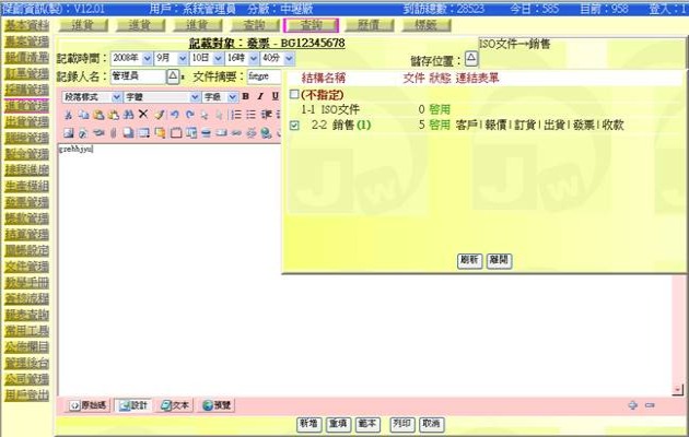 (下圖展示正在新增某一發票的跟單文件,其中可以包含有文字、圖片、表格等資訊)
