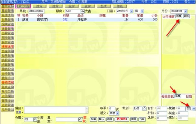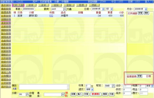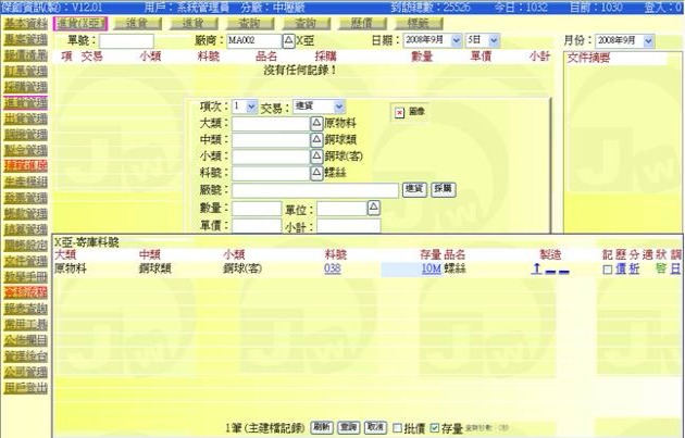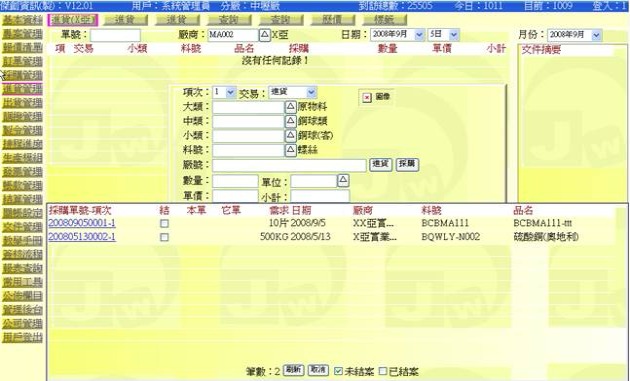 - 時機:當廠商將貨物(物料)送進公司時,一般會有一張貨品清單,上面標明有品項、數量、價格等資訊,月底結算時就是以此張單據做為憑證,而霊端 ERP 的「進貨單」就是將此張廠商交付的貨物清單內容,依廠內 ERP 的基本代碼(廠商代碼、物料代碼)與格式(進貨單格式),轉載打入 ERP 資料庫中,如此將可進一步延伸應用於其它流程作業中,例如後續的領料、對帳等。