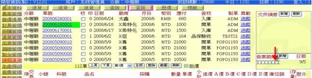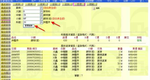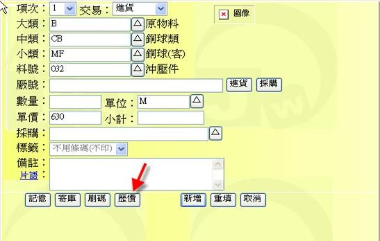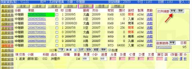- 按下「歷價」按鈕(下圖紅色箭頭處),可展開「進貨單→歷價查詢表」,從中可拷貝出歷史單價或料號基本表單中的進價。