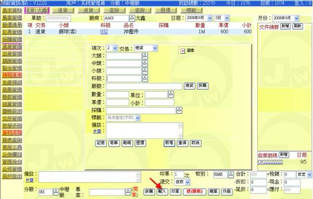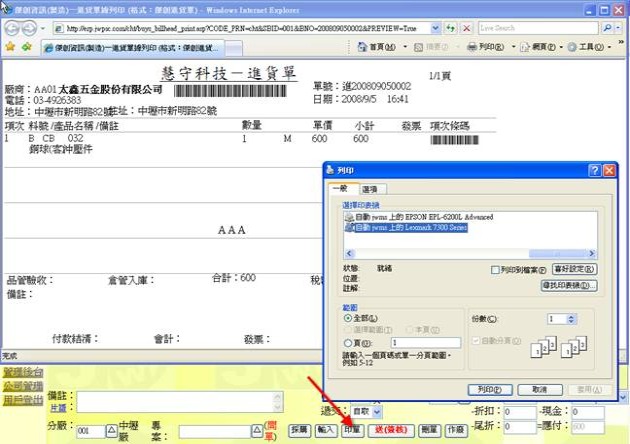 - 按下方「印單」按鈕(下圖紅色箭頭處),可套表列印此張進貨單。