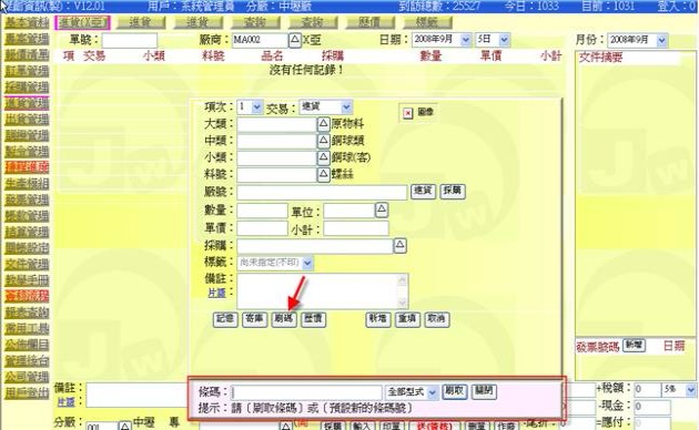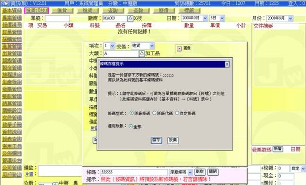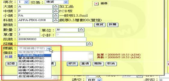 若是採用刷取修碼方式去調入品項時,當系統查找不到該條碼時,用戶一般會改採用手工方式輸入品項欄位,接著在存檔送出前,系統會訽問 "是否一併儲存下方新的條碼號" 訊息(下圖灰色窗格處),若回應要「儲存」且選好條碼型式,這時系統會將它存入該料號基本表單中的「條碼表」裏,同時判斷是否要印出(一般是非「原廠條碼」型式者皆要印出),若劏斷為是要印出,這時也會一併保存一筆標籤資訊等待列印。