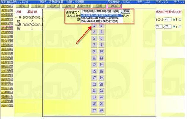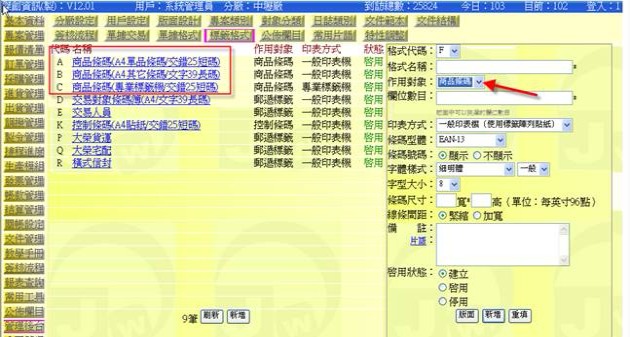 (以下圖示在「管理後台」→「標籤格式」中定義有A、B、C三種格式可供選擇)