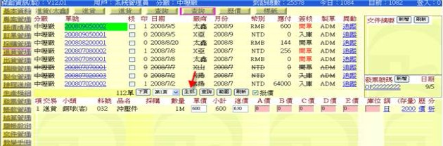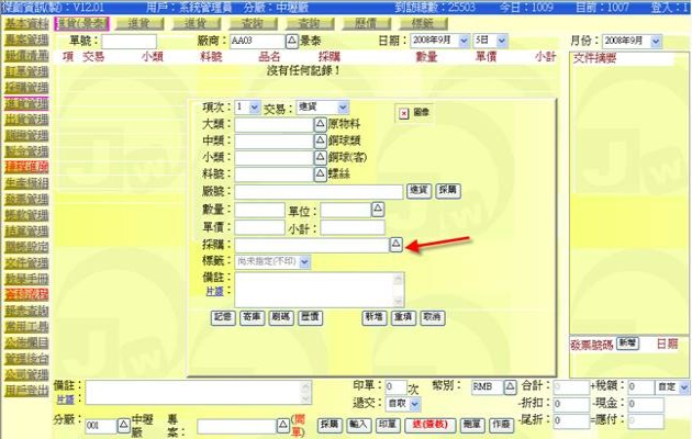 - 在中間的品項輸入窗格中,按下「採購」欄位右側三角型按鈕(下圖紅色箭頭處),或在下方單尾欄位區中,按下「採購」按鈕,即可展開與本單有相同廠商代碼的「未結案採購清單」,可從清單中挑選出相關的品項欄位。