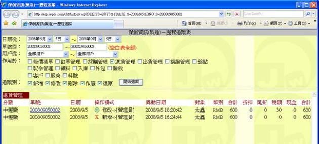異動追踪是做為一個「操作過程全記錄」的查訽工具,它可告訴你某張單據或某個對象或某個料號在什麼時侯被某個人做了什麼動作,其中包含新增、修改、刪除等任何與之有關的動作,皆會被完完整整的記錄下來,你可在此探查得知過程中發生了什麼事,這對於管理者是一個極為重要的輔助工具。