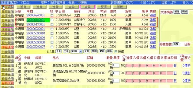 點選上方次功能中任意一個「查詢」後,即可開啟進貨帳簿,帳簿中存有每一張單據與品項明細,畫面各區域介紹如下: