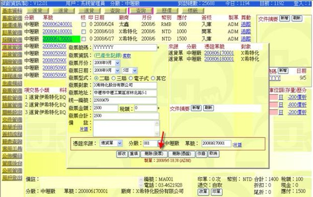 - 欲徹底刪除該發票記錄,請再次點選 200806180001 的發票資訊。