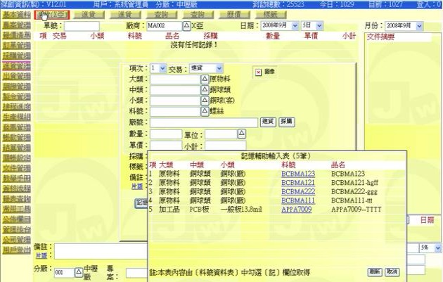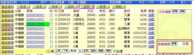 - 清除「廠號」欄位,再按下該欄右側「進貨」按鈕,即可展開「進貨查詢表」,可從清單中挑選出相關的品項欄位,若該筆廠號也會拷貝出此欄位。