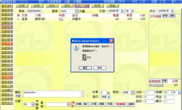 (下圖示範若有異動單頭欄位,它會提示檢查並詢問是否存入)
