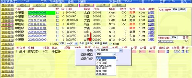- 按下「查詢」按鈕(下圖紅色箭頭處),即可出現「查詢欄位」與「查詢內容」窗格,可在此指定欄位並輸入內容進行查找,找到時會將單號以閃動字體方式呈現。