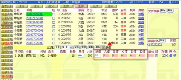 - 勾選「批價」選項(下圖紅色箭頭處),可以比對並修改進貨單價和料號基本價(A、B、C、D、E)。
