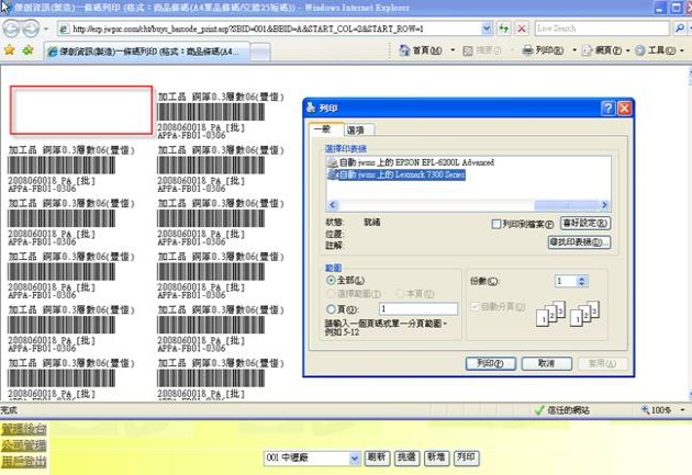 - 選擇完列印位置後,按下「列印」按鈕,就可呈現出有條碼圖的結果網頁,並會自動打開選擇印表機 的視窗,接著選好印表機,按下該視窗中的「列印」按鈕就可打印在紙上了。
