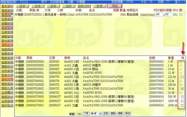 - 當挑選表展開後,直接在右側「挑」這個勾選項上打勾即可加入該筆,成為標籤列印資訊(下圖紅色箭頭處)。
