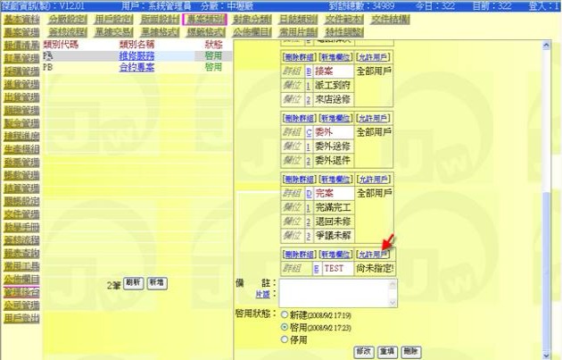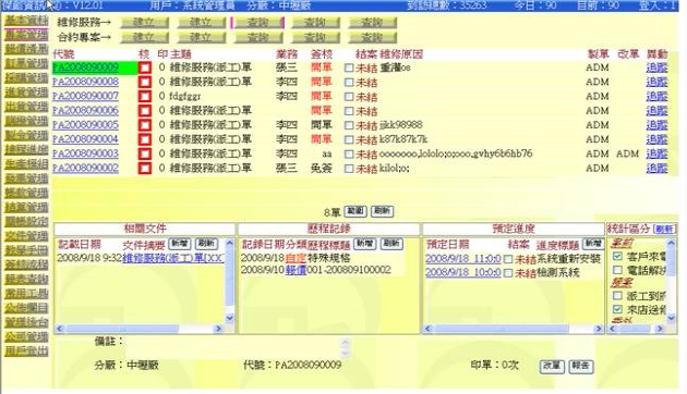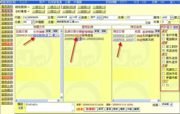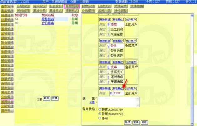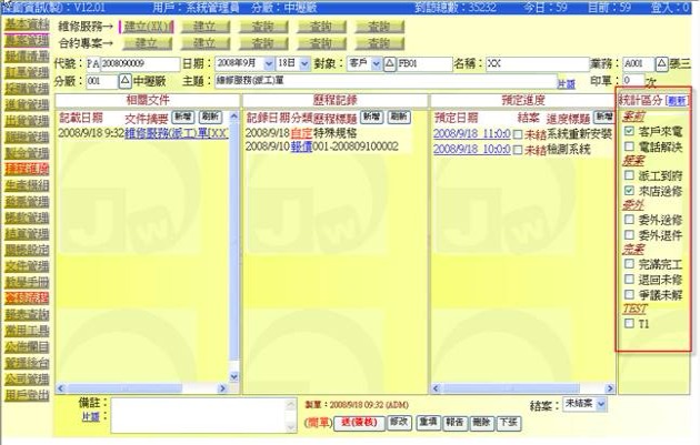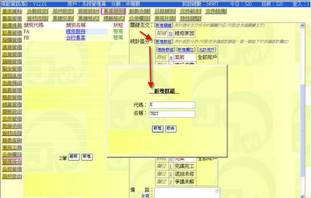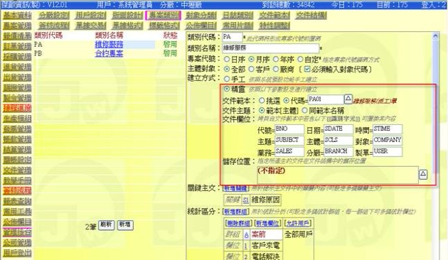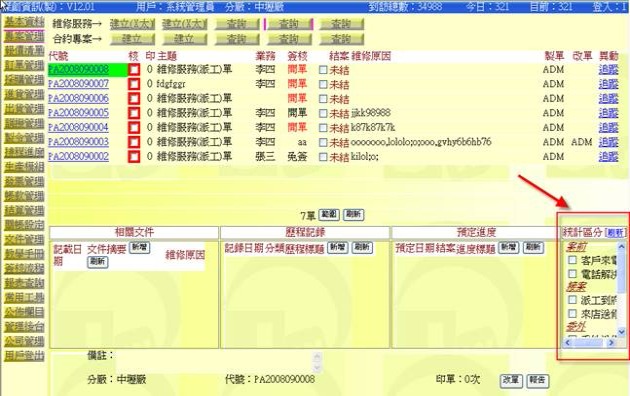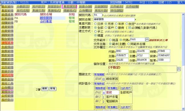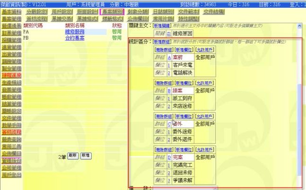 - 統計區分的設定,又可以被組織為上下二層,上面一層叫做「群組」,而下面一層就叫「區分」;例如在維修專案這個類別中,我們可以設定 4 個群組,分別為「案前、接案、案外、完案」,而其中在「案前」群組下又設定有「客戶來電、電話解決」這二個區分;並且假如我們在接案時為每個客戶建立起 一個專案做為對應,這時當某個客戶第一次來電詢修時可能在電話中解決了問題,我們可以在該專案上勾選為「電話解決」,又過了不久該客戶又再次來電叫修, 但這次我們採用了派工處理,當派工完成後,我們可再次打開該專案並在其中加勾選「派工到府」這個選項;如此經過以上二個過程後,該專案已被勾選有二個統計區分,分別為「電話解決 」與「派工到府 」;這樣就可從這一個專案上很清楚的知道出一個總結,並且日後還可以針對「派工到府 」這個區分,統計出到底有多少個專案有勾選。