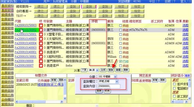- 按下「查詢」按鈕(下圖紅色箭頭處),即可出現「查詢欄位」與「查詢內容」窗格,可在此指定欄位並輸入內容進行查找,找到時會將單號以閃動字體方式呈現。