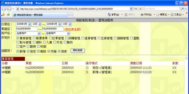異動追踪是做為一個「操作過程全記錄」的查訽工具,它可告訴你某張單據或某個對象或某個料號在什麼時侯被某個人做了什麼動作,其中包含新增、修改、刪除等任何與之有關的動作,皆會被完完整整的記錄下來,你可在此探查得知過程中發生了什麼事,這對於管理者是一個極為重要的輔助工具。