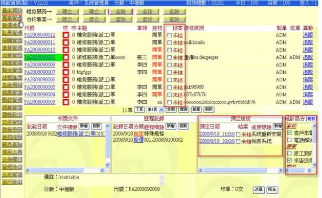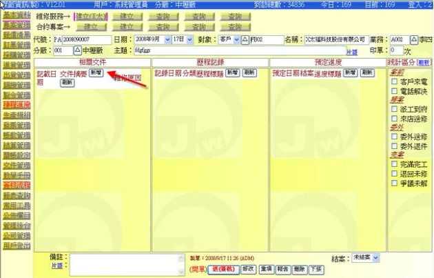- 下方區域:相關文件表、歷程記錄表、預定進度表、統計區分表。