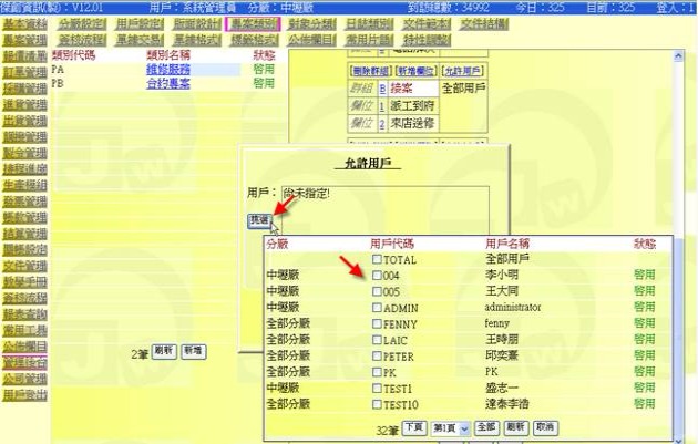 - 步驟 4:點擊 "允許用戶表" 中的「新增」按鈕,然後在操作用戶表中勾選用戶代碼,可以指定授予那些操作用戶在專案中可去勾選 "統計區分" 選項 的權限。