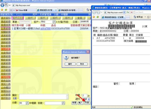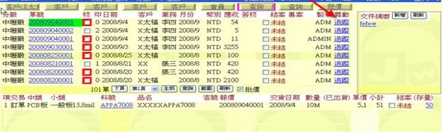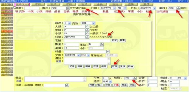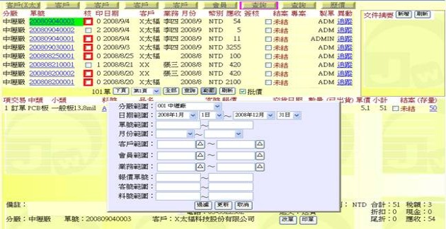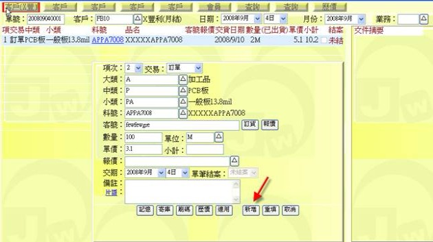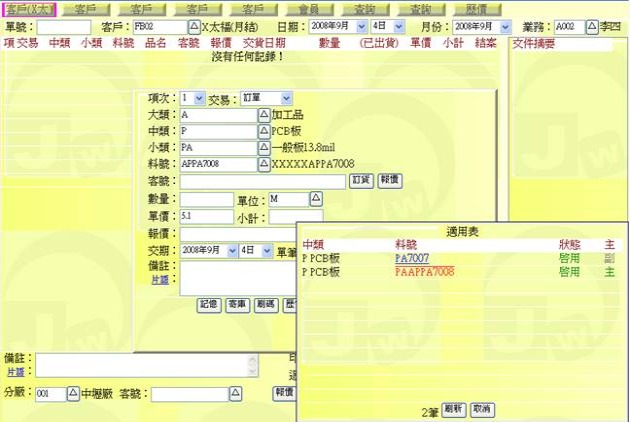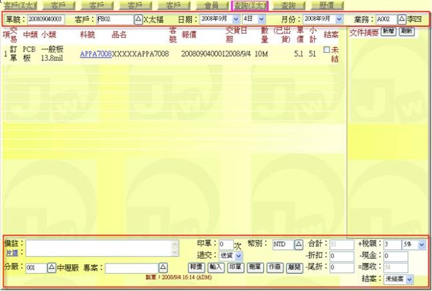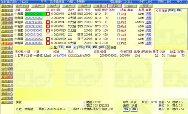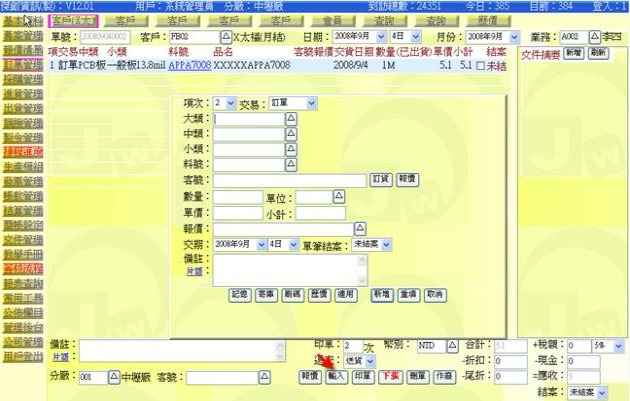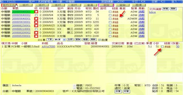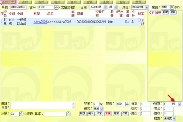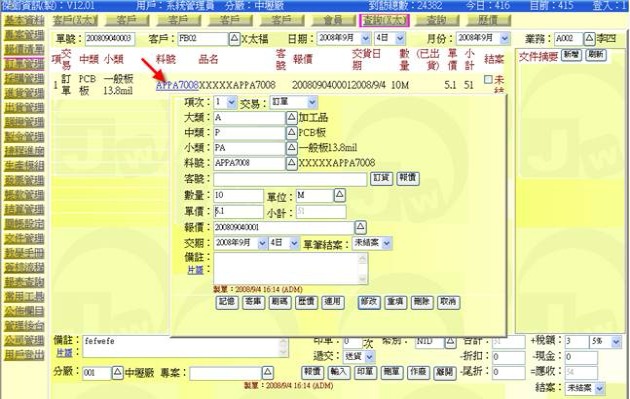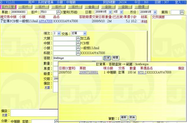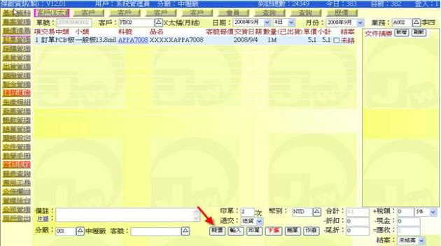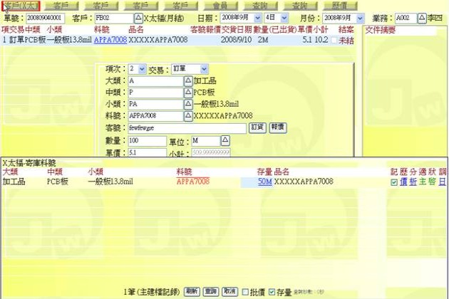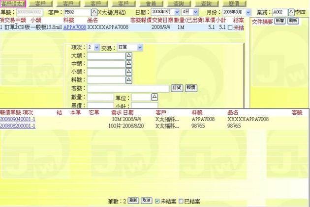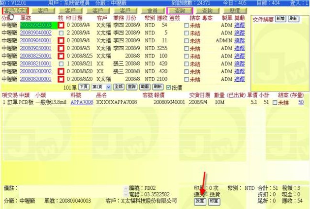 (下圖示範被叫出的單據,注意上方次功能的「查詢(X太)字樣」,它代表正在修改的單子屬於X太陽這個客戶)