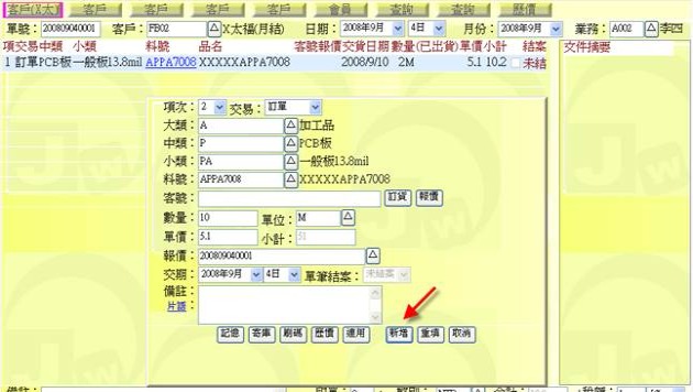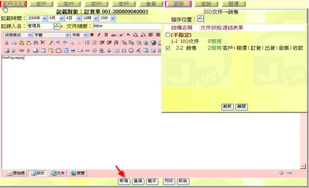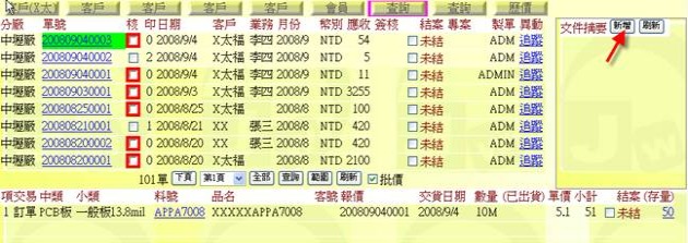 - 按下右側上方文件區的「新增」按鈕(下圖紅色箭頭處),可以輸入與該單有關的相關文件,例如交易過程中的 Email 摘要、客戶指示的規格圖示等。