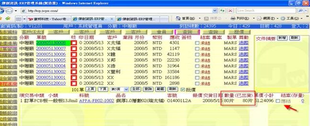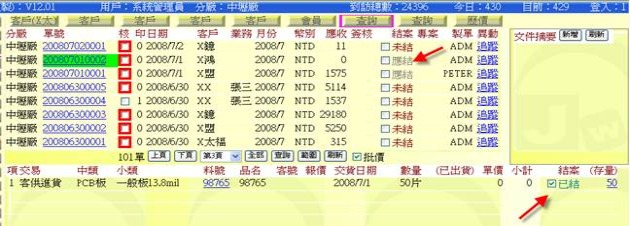 - 如果某單筆明細的「已出貨數量」已達「訂貨單數量」,則在「結案」欄位會閃爍著「應結/未結」交替文字,表示此筆明細應該要進行結案。