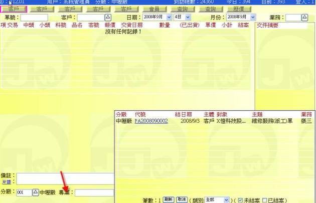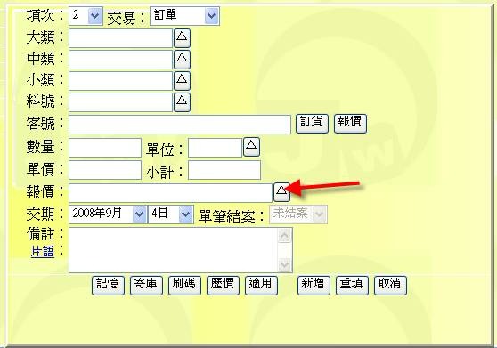- 在中間的品項輸入窗格中(下圖紅色箭頭處),或在下方單尾欄位區中,按下「報價」按鈕,即可展開與本單有相同客戶代碼的「未結案報價清單」,可從清單中挑選出相關的品項欄位。