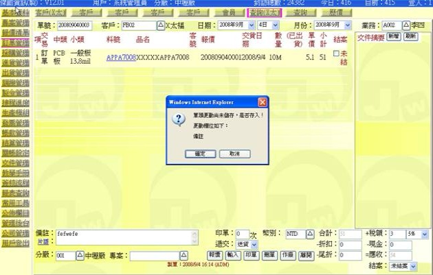(下圖示範若有異動單頭欄位,它會提示檢查並詢問是否存入)