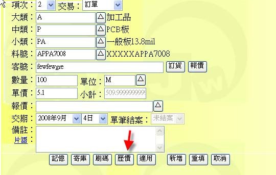 - 按下「歷價」按鈕(下圖紅色箭頭處),可展開「訂貨單→歷價查詢表」,從中可拷貝出歷史單價或料號基本表單中的五種售價中的一種(A、B、C、D、E價)。