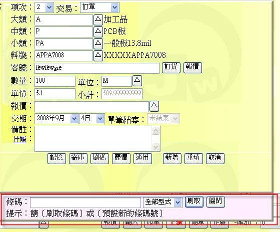(下圖下方顯示出「條碼刷取控制板」,透過它可模擬出有如門市 POS 刷取條碼的訂單動作,我們的客戶群中,有些是黑手出身電腦程度不高者極為喜愛此種操作模式)