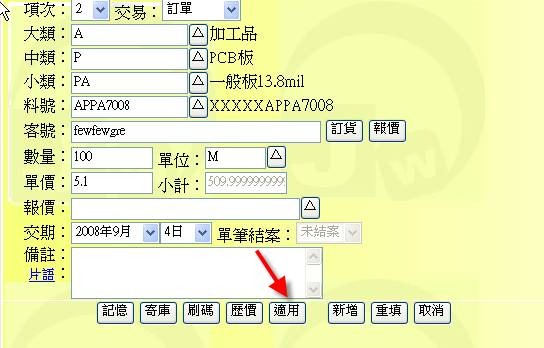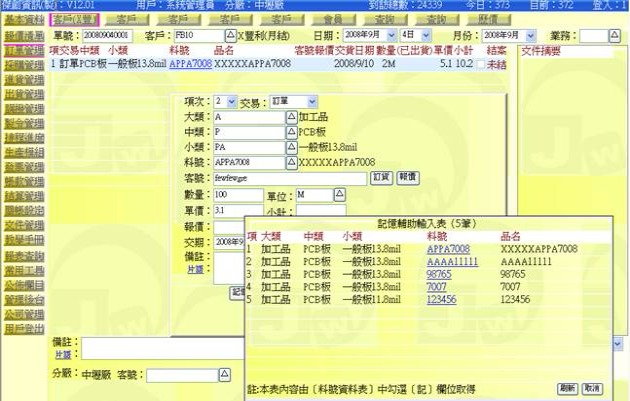 (下圖示範「記憶表」清單,點選表中的某「料號」即可拷貝出相關的品項欄位)