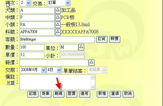 - 按下「寄庫」按鈕(下圖紅色箭頭處),可從寄庫表中挑選出相關的品項欄位。