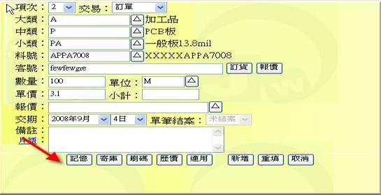 - 按下「記憶」按鈕(下圖紅色箭頭處),可從料表中有勾選出的記憶表中挑選出相關的品項欄位。