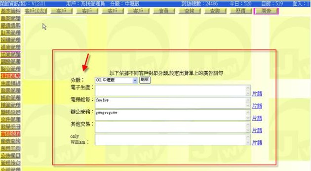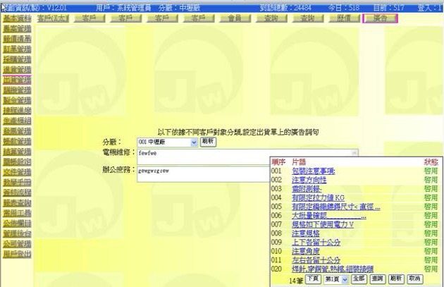註1:下圖中 "電機維修" 和 "辦公庶務" 欄位名稱指的就是客戶分類歸屬,每一筆客戶在基本表單中都必須指定一個分類歸屬,如此在廣告設定中就可依據不同的客戶分類進行不同的廣告詞,這樣的功能極為靈活。