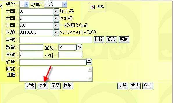 - 按下「寄庫」按鈕(下圖紅色箭頭處),可從寄庫表中挑選出相關的品項欄位。
