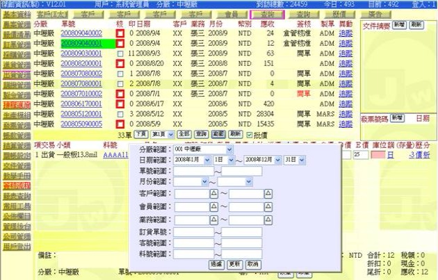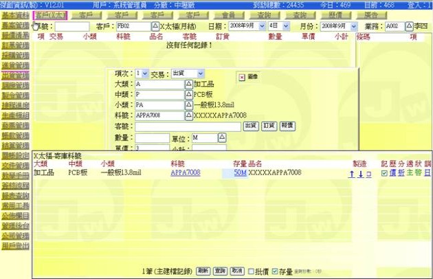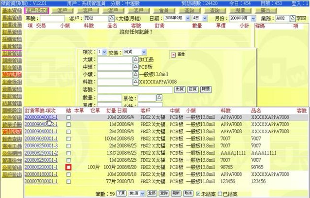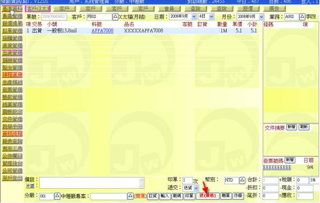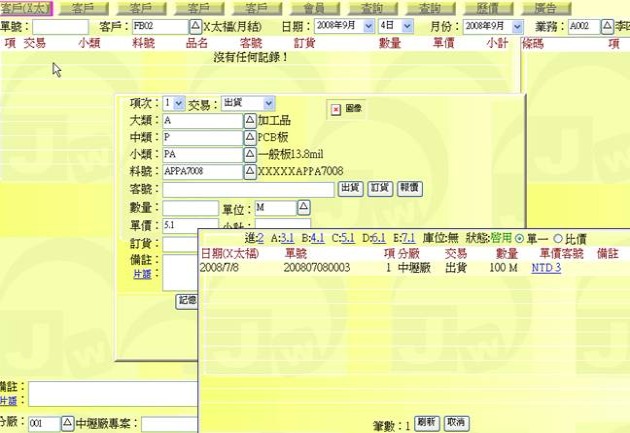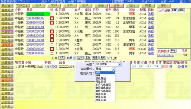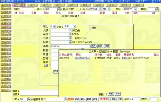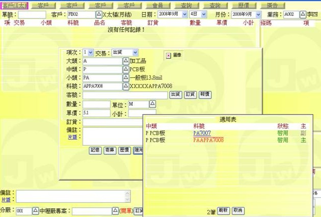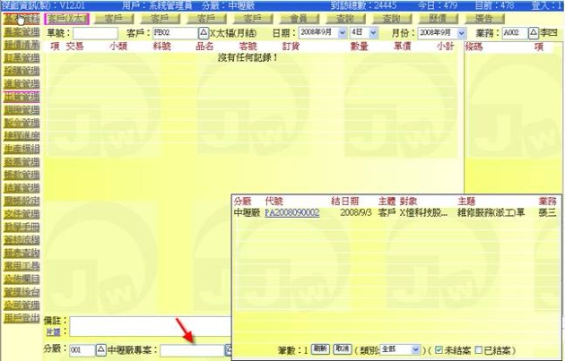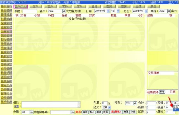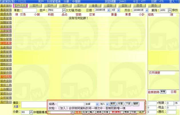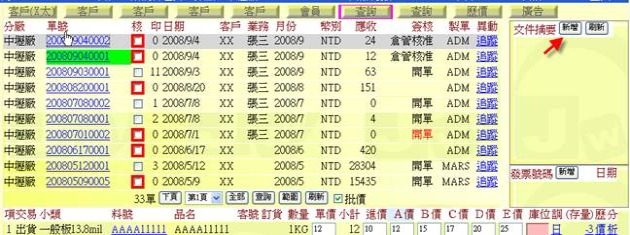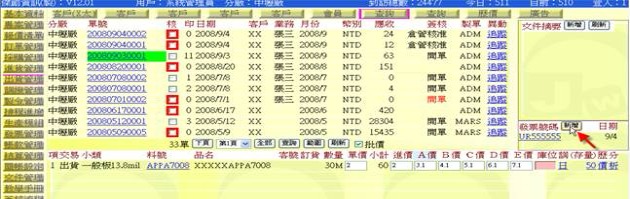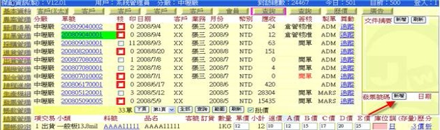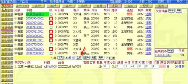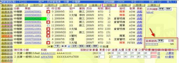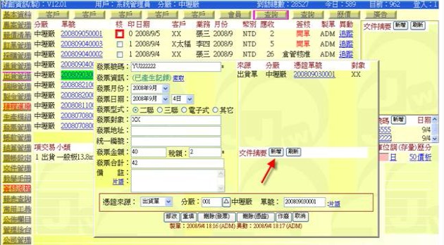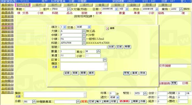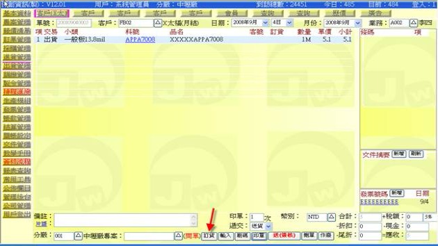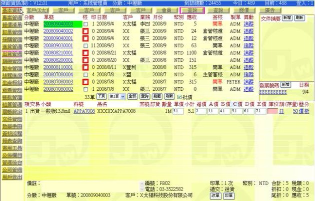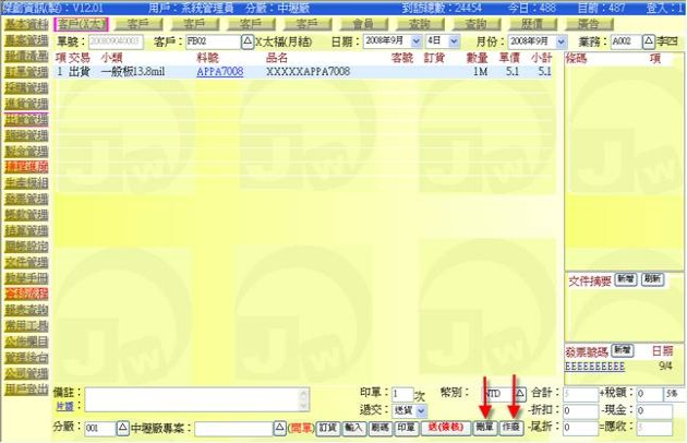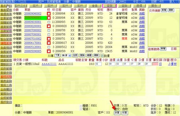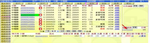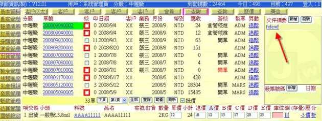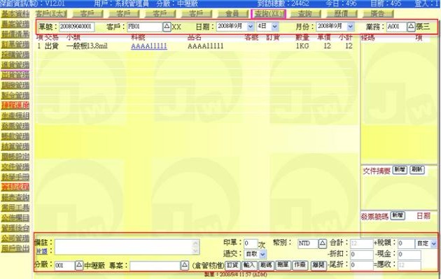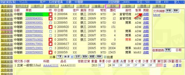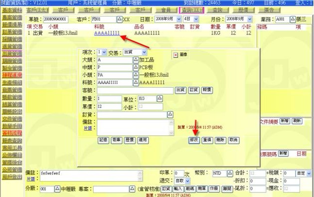 (下圖示範被叫出的單據,注意上方次功能的「查詢(XX)字樣」,它代表正在修改的單子屬於XX這個客戶)