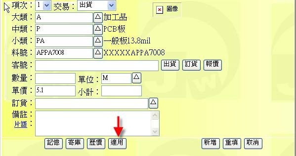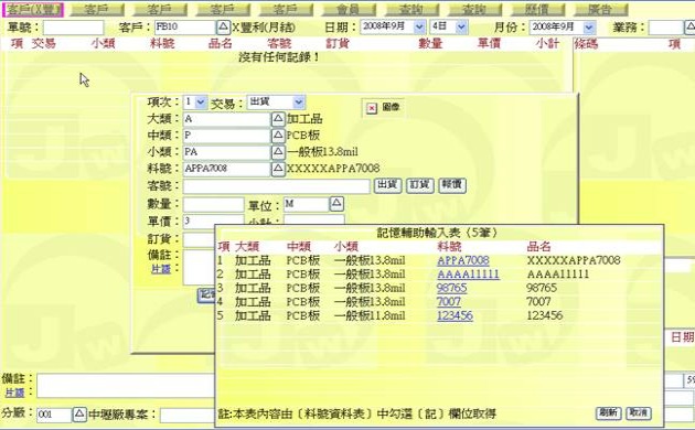 (下圖示範「記憶表」清單,點選表中的某「料號」即可拷貝出相關的品項欄位)