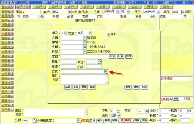 - 在中間的品項輸入窗格中(下圖紅色箭頭處),或在下方單尾欄位區中,按下「訂貨」按鈕,即可展開與本單有相同客戶代碼的「未結案訂貨清單」,可從清單中挑選出相關的品項欄位。